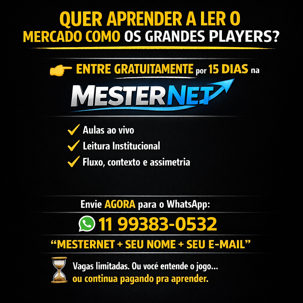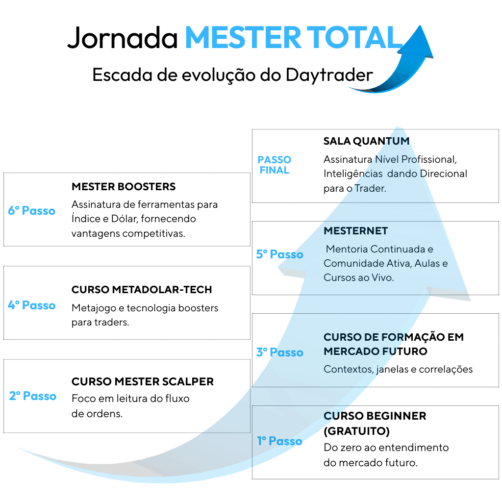 MesterBeginner, MesterScalper, MesterPro, MesterBoosters, Índice Futuro, Bitcoin Futuro, Renda Fixa, Psicologia para Traders. Planilhas, PDFs e materiais adicionais para maximizar o seu aprendizado.