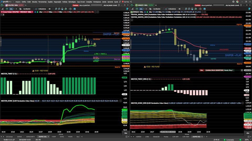 A Sala Quantum não é “sala de sinal”. É um ambiente de inteligência que transforma dados de mercado em decisões claras — com direção institucional, pontos de entrada mapeados e Stop Loss máximo definido para cada cenário.